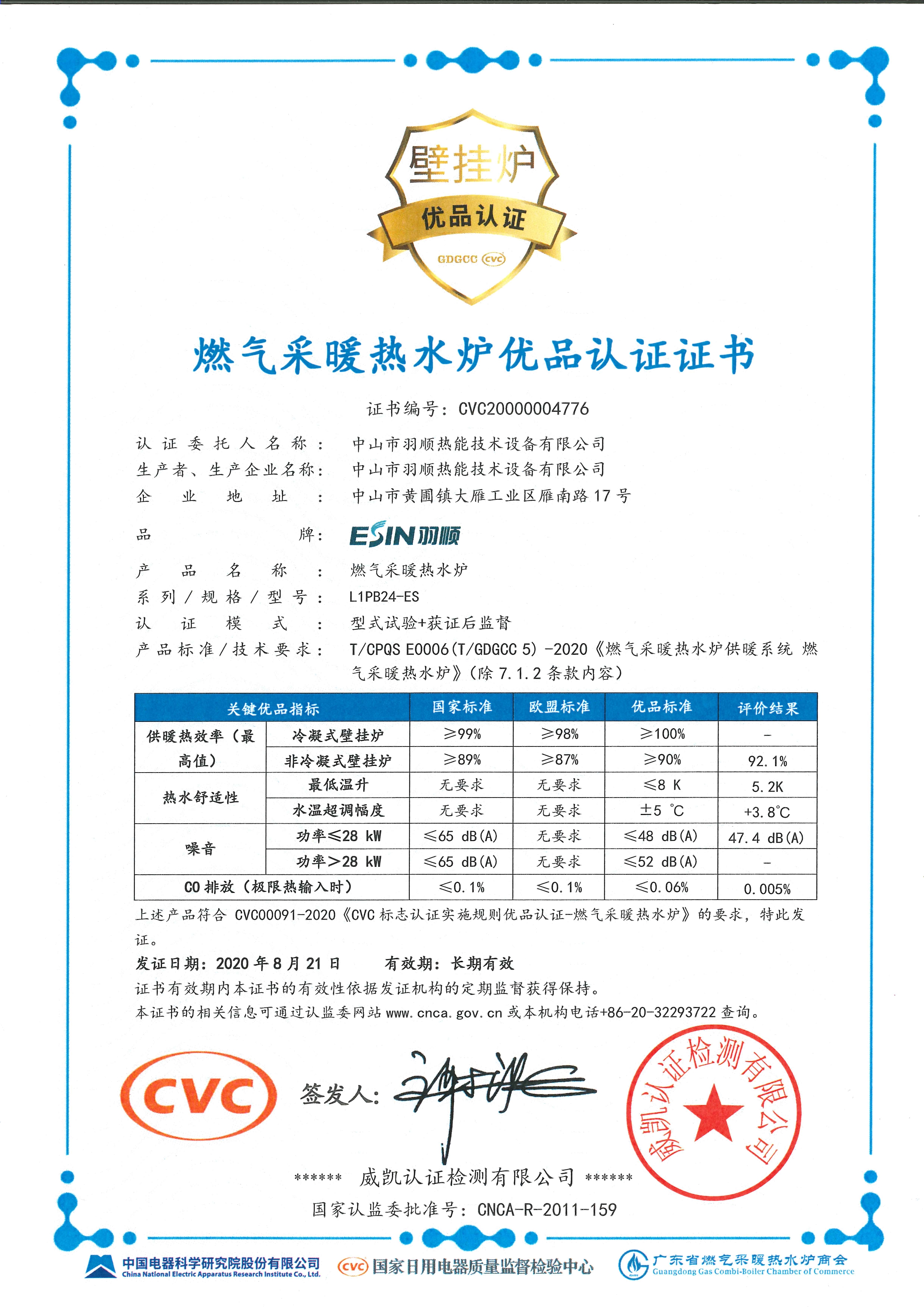 中國壁掛爐優(yōu)品證書